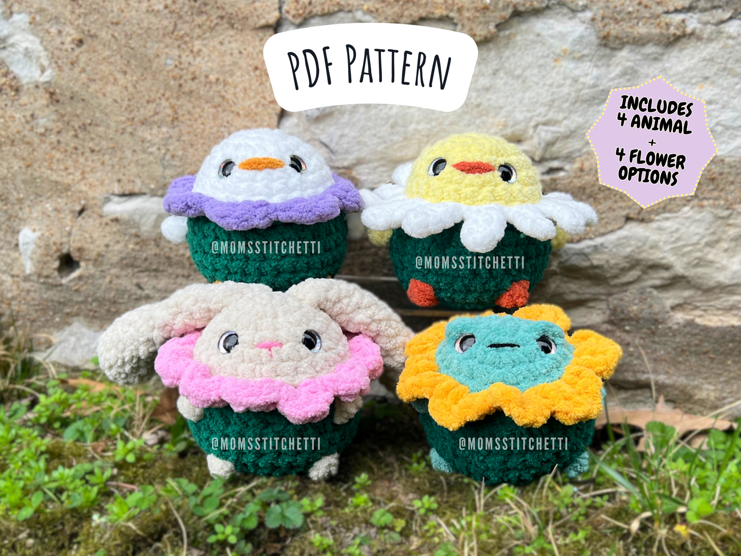 Say hello to the Flower Chonks! This pattern includes instructions to make a bunny, frog, chick, or duck and 4 different interchangeable petal styles to make your own customized plushie!