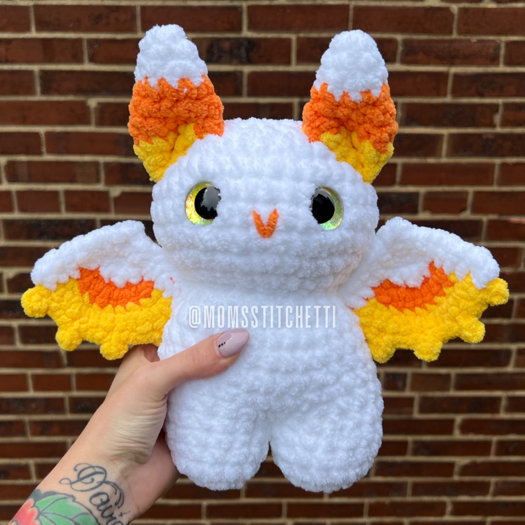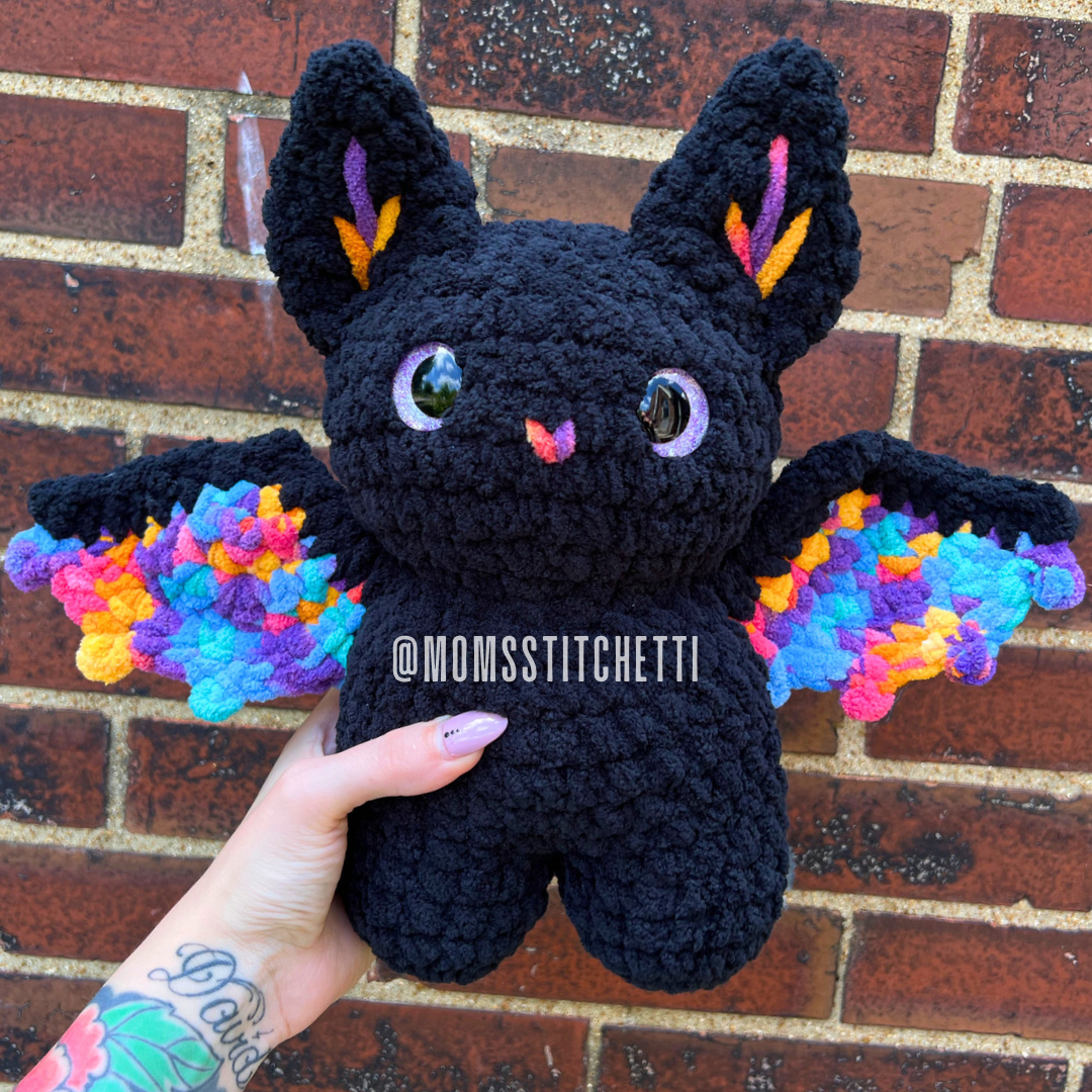 Say hello to Beatrix the Bat! This crochet pattern is written in US terminology (English) and includes a list of materials, instructions, and photos to help you along! The body is one piece which means no sewing on the legs or head!