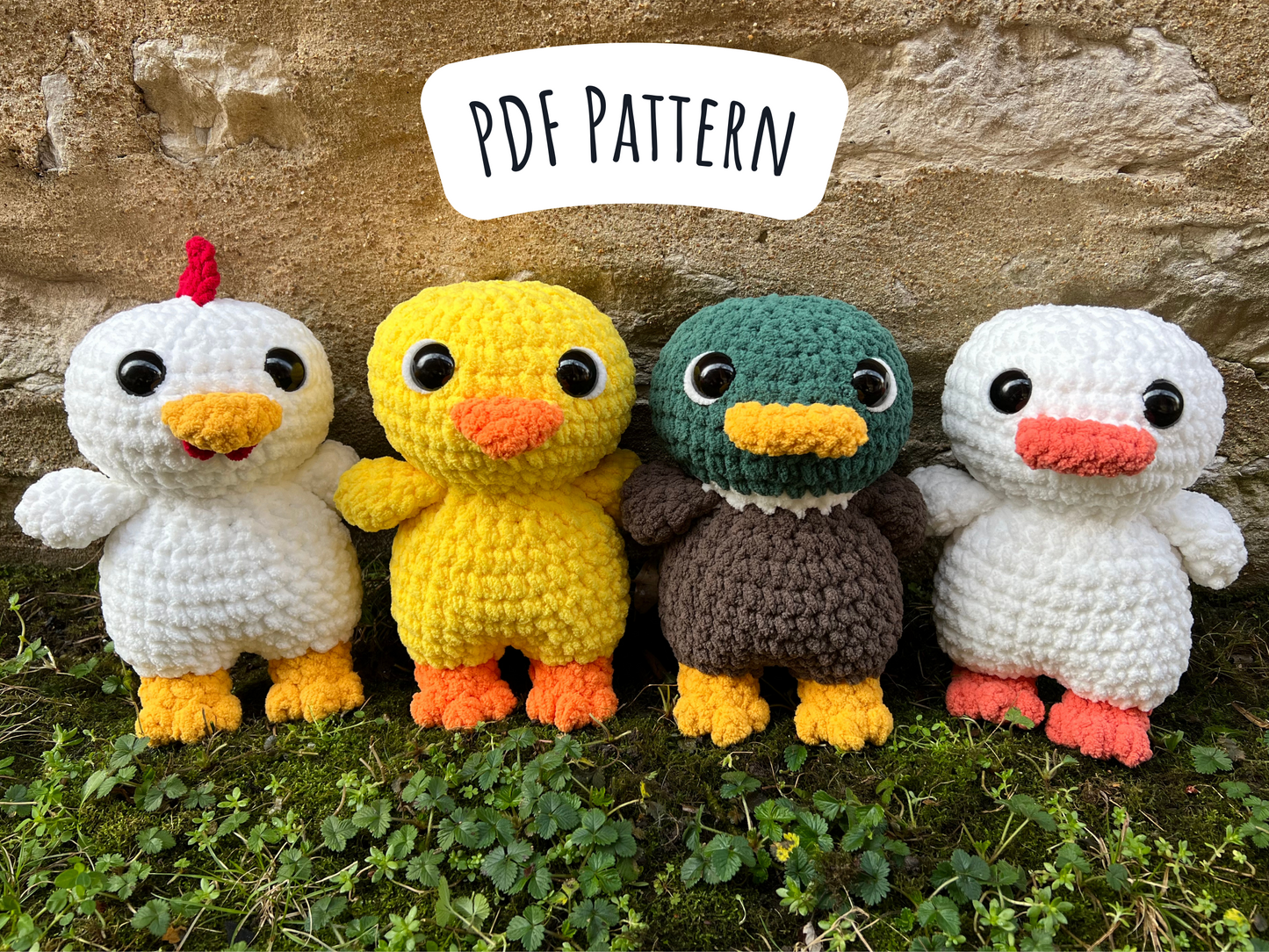 Say hello to the Farm Birds! This 4-in-1 crochet pattern has instructions to make a Mallard Duck, Goose, Chick, and Chicken. This pattern is written in US terminology (English) and includes a list of materials, instructions, and photos to help you along! This pattern is NO SEW and works up super fast!