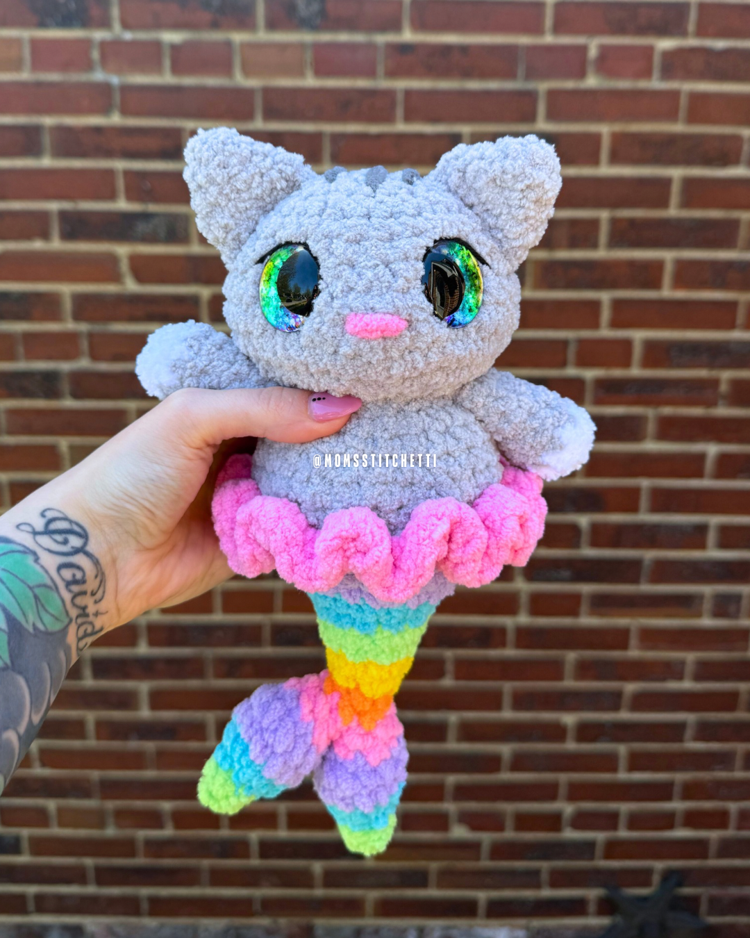 This crochet cat plush is made with super soft 100% polyester yarn.
