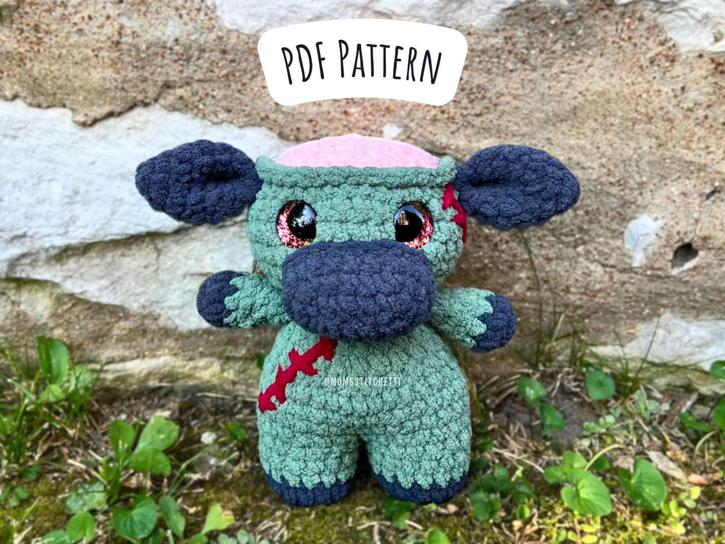 Say hello to the Zombie Cow! This crochet pattern is written in US terminology (English) and includes a list of materials, instructions, and photos to help you along! The body is one piece which means no sewing the legs, arms, or head!